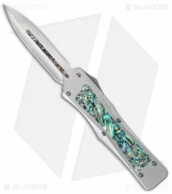 This Marfione Custom Troodon features a hand hefted stainless steel handle with abalone inlays front and back. The handle is sans pocket clip and glass breaker. The double-edge stainless steel blade is hand ground with a mirror polish on the grinds and perfectly fitted abalone inlays. Includes zippered pouch. The Marfione Dagger and model information are located on the side. This knife is new from the maker.