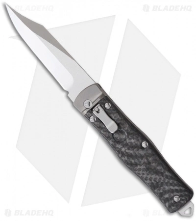 The production Microtech Cobra knives are in! This one sports a satin Bowie style S35-VN stainless steel blade with a plain edge. The handle is carbon fiber with titanium spacers and bolsters. The pocket clip has the serial number, date and model information.