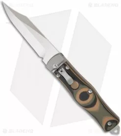 The production Microtech Cobra knives are in! This one sports a satin finished Bowie style S35-VN stainless steel blade. The Camo handle is layered tan, green and black G10 with titanium spacers and bolsters. The pocket clip has the serial number, date and model information.