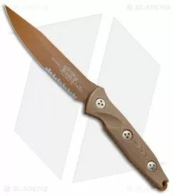 - Tan serrated drop point blade.