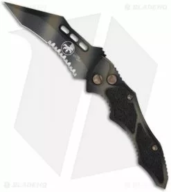 This Microtech Vector automatic knife features a tan camo finished blade and handle with bronze colored hardware and pocket clip. The S35-VN stainless steel blade has a partially serrated edge. The aluminum handle has textured grip inserts on front and the frame is tapered front to back with an open build and barrel spacers.