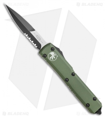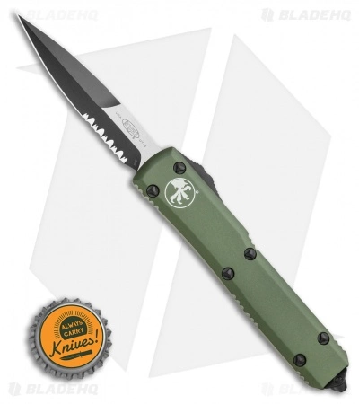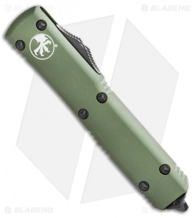 This Ultratech features a Bayonet style blade that features double edged- the top edge is about 2/3 the length of the blade. The black finished blade is stainless steel with a partially serrated edge. The olive drab green anodized 6061-T6 aluminum handle has bead blast finished pocket clip, glass breaker and stainless steel hardware. This model has the raised tri-wing screws on the handle.