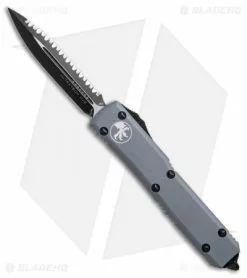 This Ultratech features a double edged dagger blade with a black finish and a fully serrated top edge. It has a contoured, gray anodized 6061-T6 aluminum handle with a black finished pocket clip, glass breaker, and stainless steel hardware.