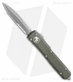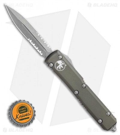 This Ultratech features a drop point blade with a stonewash finish and a partially serrated edge. It has a contoured, OD Green anodized 6061-T6 aluminum handle with a bead blasted pocket clip, glass breaker, and stainless steel hardware.