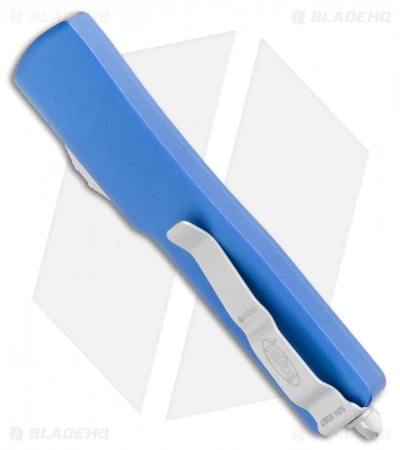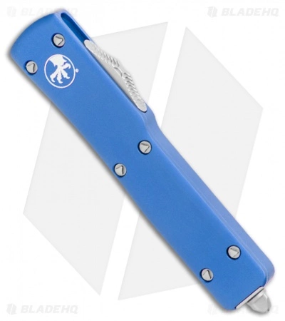 This UTX-70 features a blue anodized aluminum handle. The double edged dagger blade is stonewash-finished CTS-204P stainless steel. The pocket clip and hardware are bead blast finished.