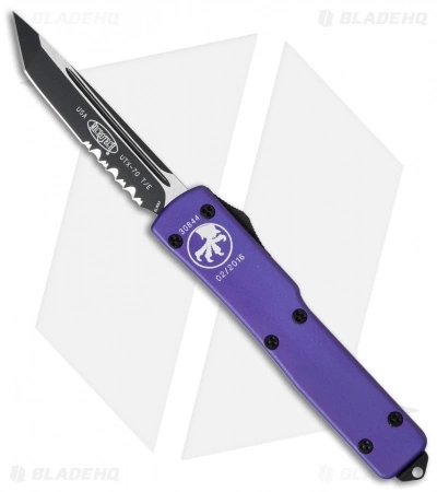 This UTX-70 has a black finished tanto blade with a partially serrated edge and purple anodized 6061-T6 aluminum chassis with tactical black hardware and pocket clip.