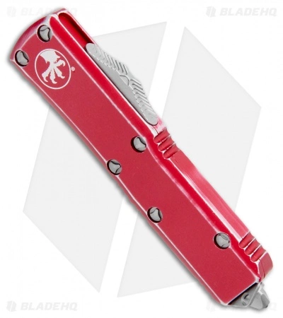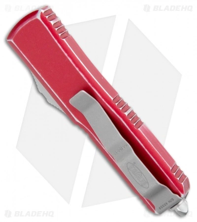 This UTX-85 model is equipped with a stonewashed, double-edged dagger blade. The 6061-T6 aluminum handle is distressed red anodized and outfitted with bead blast finished hardware, pocket clip, and glass breaker tip.