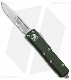 This UTX-85 model has a partially serrated, satin finished steel blade. The 6061-T6 aluminum handle is OD green anodized and outfitted with bead blast finished hardware, pocket clip, and glass breaker tip.