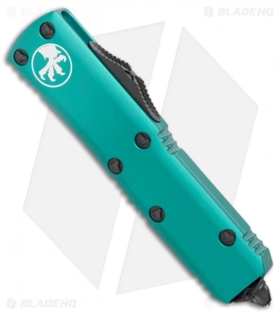 This UTX-85 model has a partially serrated, black finished Elmax steel blade. The 6061-T6 aluminum handle is turquoise anodized and outfitted with black finished hardware, pocket clip, and glass breaker tip.
