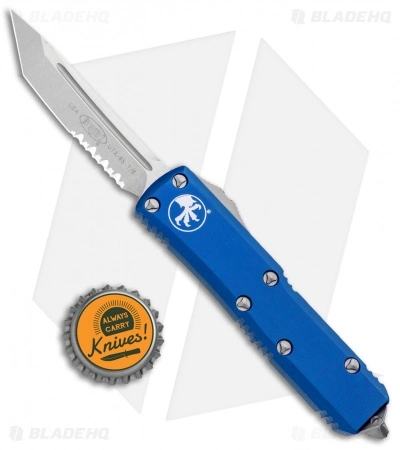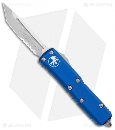 This UTX-85 model has a stonewashed tanto blade with a partially serrated edge. The 6061-T6 aluminum handle is blue anodized and outfitted with bead blasted hardware, pocket clip, and glass breaker tip.