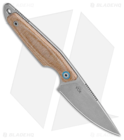 - Natural canvas micarta handle scales on top of a skeletonized tang.