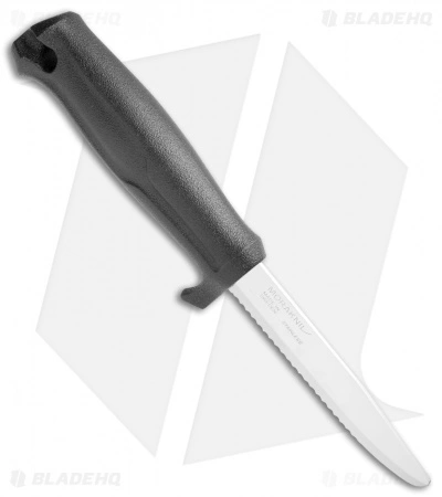 The Morakniv Marine Rescue fixed blade is designed to perform at sea or by the water. Its textured polymer handle is contoured for a solid grip, and the finger guard keeps your hand safely away from the blade. The stainless steel blade features a fully serrated cutting edge to make quick work of rope and other materials, and has a blunt safety tip to prevent stab wounds. Includes a black polymer belt sheath.