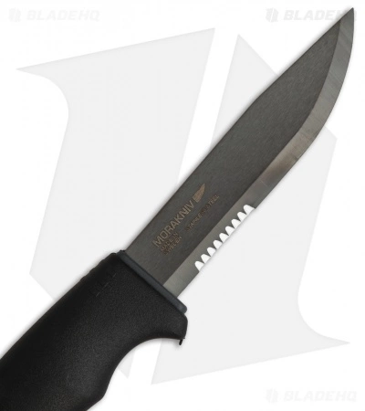 The Morakniv Tactical SRT knife has the robust construction of the Bushcraft SRT but features a MOLLE-compatible sheath. It has a 1/8″ thick Sandvik stainless steel blade with a back-cut spine, which makes it great for use with the integrated ignition fire steel. The handle has a black friction grip for comfortable performance in wet and cold conditions.