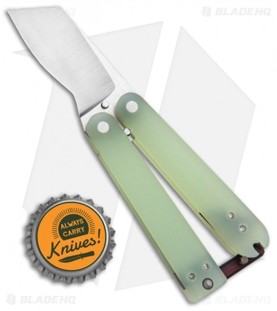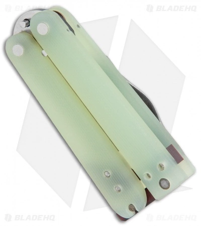 This Gremlin balisong was made for Blade HQ by Nathan Dewey. It has a satin finished 440C stainless steel wharncliffe blade. This compact butterfly knife has a jade G-10 handle and latch. Includes a stainless steel pocket clip and spare hardware.
