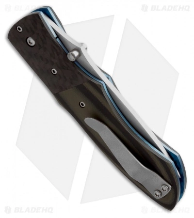 This Dihedral custom knife has an eye-catching array of materials and finishes. The handle is outfitted with carbon fiber bolsters and layered green/black G-10 scales. Blue anodized titanium liners and orange peel textured satin pocket clip round it out. The blade is hand satin finished CPM-154 stainless steel.