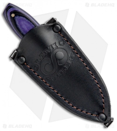 The Olamic Cutlery Neck knife offers a custom hand-made design that is perfect for collection or EDC. This model is outfitted with a beautiful Damascus steel blade and purple/blue micarta handle scales. Item comes with a premium leather sheath for neck carry.