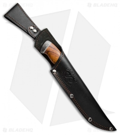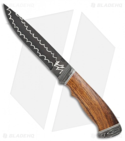 This Suna knife from Olamic Cutlery is an exceptional handmade fixed blade. The drop point blade is black coated nickel carbon mosaic Damascus steel. The tang is stamped 155 on the back side, which is the unique knife number. The handle is made from Arizona Desert Ironwood and features nickel carbon mosaic Damascus (NCMD) fittings. The pommel cap is Damascus and the handle is fitted with G10 accent inserts. The Suna fixed blade comes with a premium black leather sheath with belt loop.