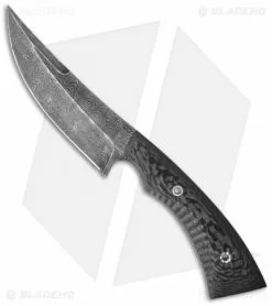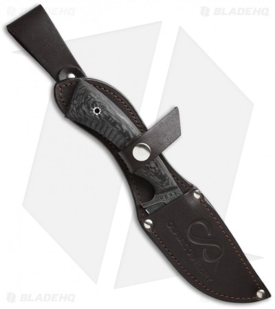 The Nero is a fine hand-crafted fixed blade from Olamic Cutlery. The full-tang high carbon vanadium Damascus Persian blade has an upswept tip and swedge. Contoured carbon fiber scales adorn the handle and taper at the butt. Includes leather sheath with belt loop.