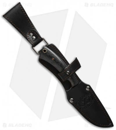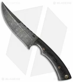 The Nero is a fine handcrafted fixed blade from Olamic Cutlery. The full-tang high carbon vanadium Damascus trailing point blade has an upswept tip and swedge. The handle has carbon fiber scales and white liners with mosaic pins. Includes leather sheath with belt loop.