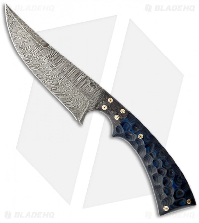 The Nero is a fine hand-crafted fixed blade from Olamic Cutlery. The full-tang HCVD “Twist” pattern Damascus trailing point blade has an upswept tip and false edge. The handle is dressed up with layered black/blue G10 scales and carbon fiber bolsters along with mosaic pins. Includes leather sheath with belt loop.