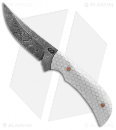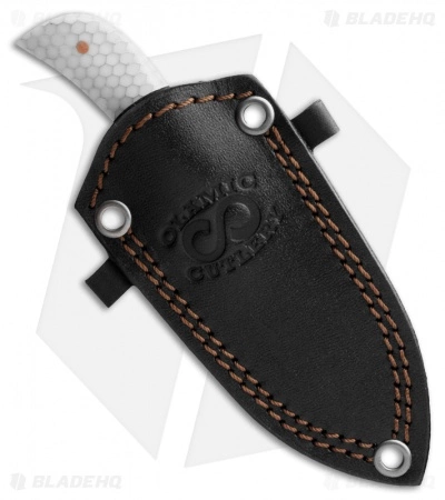This Persian-style neck knife has a beautiful HCVD Damascus steel blade and white C-Tek scales. The Persian fixed blade comes with a premium leather sheath.