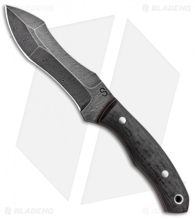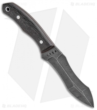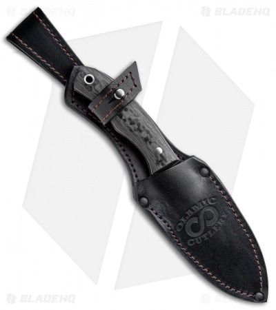 This RN45 fixed blade from Olamic Cutlery features an HCVD Damascus steel blade. It has a black micarta handle and comes equipped with a black leather sheath.