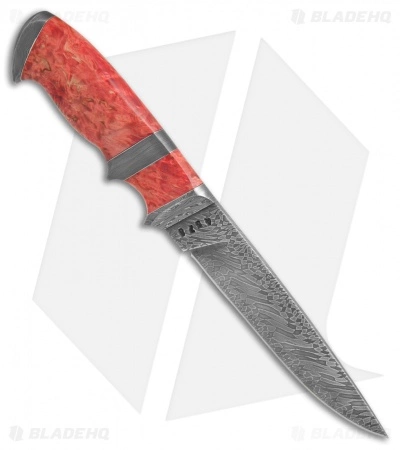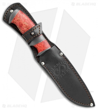 This handcrafted Suna fixed blade features a Marbled Damascus steel blade. It sports a Red Karelian Birch handle with Damascus steel bolsters. The knife includes a leather sheath with a dangler attachment for comfortable belt carry.