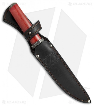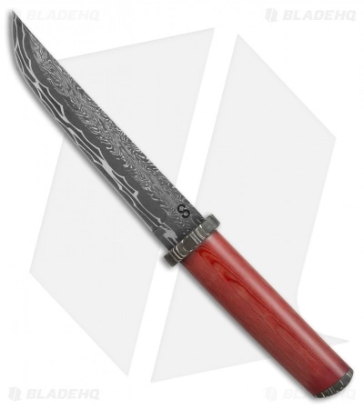 This Tanto Elite fixed blade from Olamic Cutlery is an exceptional handmade knife with a muti-bar nickel carbon mosaic Damascus steel blade. Its handle is fitted with smooth maroon Micarta and features nickel carbon mosaic Damascus (NCMD) fittings. Includes a premium black leather sheath with belt loop and dangler attachment.