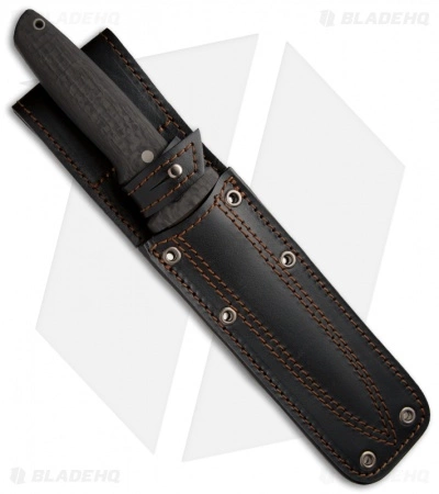 It features a D2 steel spear point blade with fuller and swedge. The handle is carbon fiber with rounded edges and lightly textured faces. The Terzuola fixed blade comes with a premium leather sheath.