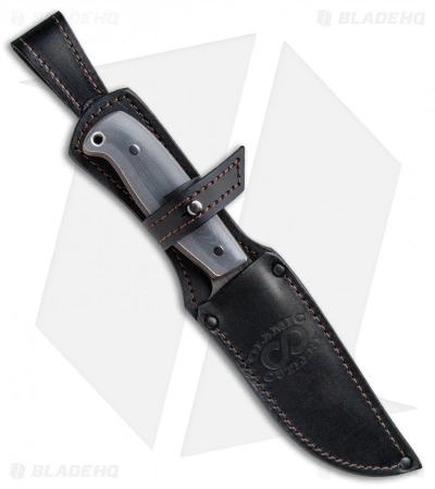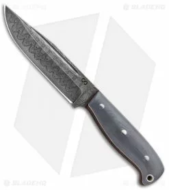 The Voykar FT knife from Olamic Cutlery features a San Mai Damascus clip point blade and a gray G-10 handle. The Voykar FT fixed blade comes with a premium black leather sheath.