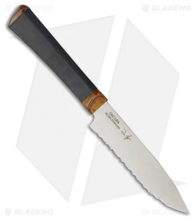 The Ontario Utility Kitchen knife features a 5″ Sandvik 14C28N fully serrated steel blade. Fantastic for cutting vegetables or any item with a tough outer skin. Wide spaced serrations allow for a smoother cut with less tearing and deformation. Comfortable black Kraton handles fit well in hand and have attractive amber accents.