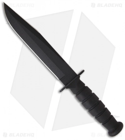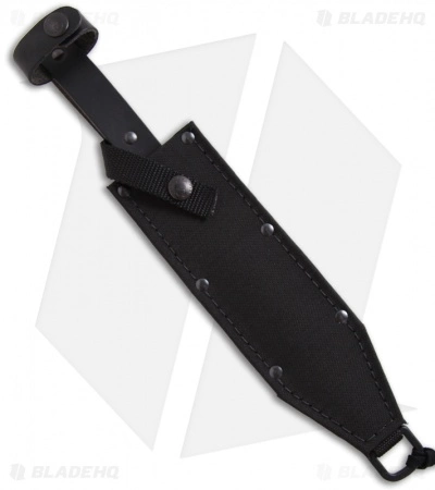 The Ontario Freedom Fighter FF-6 has a capable 8 inch 1095 steel clip point blade with a partially sharpened upper edge in addition to the primary cutting edge. This knife features a tactical black powder coated blade and a Kraton rubber handle with steel guard and pommel cap. The sheath is nylon and leather with a belt loop.