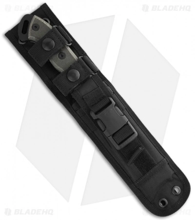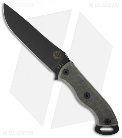 The TFI Ranger from Ontario Knives features a stout 1/4″ thick 5160 steel blade, black powder coated for stealth and corrosion resistance. The handle is outfitted with black Micarta scales that provide a sure grip. Full-tang design with extended pommel and lanyard slot. The Ranger TFI comes with a MOLLE compatible heavy duty nylon sheath. This one has a brown colored logo.