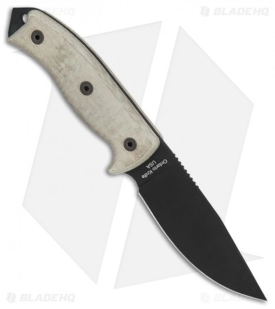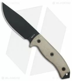 The RAT-5 fixed blade from the Ontario Knife Company (OKC) is not a knife to be trifled with. The full tang blade is constructed from 1095 carbon steel (55-57 HRC) with a flat grind for a high performance edge. Tan canvas micarta scales provide a secure and comfortable grip in the most difficult outdoor conditions. The handle sports two ergonomic finger grooves that rest nicely in the hand with a finger choil. Item includes a MOLLE compatible nylon sheath.