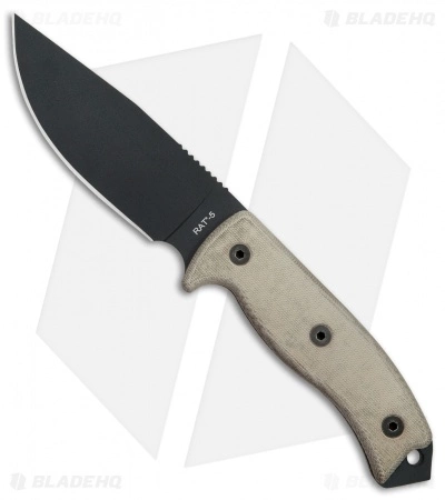 This Rat-5 model features a tan micarta handle and a black coated blade with a plain edge.