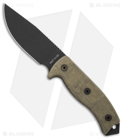 The RAT-5 fixed blade from the Ontario Knife Company (OKC) is not a knife to be trifled with. The full tang blade is constructed from 1095 carbon steel with a flat grind for a high performance edge. The canvas micarta scales provide a secure and comfortable grip in the most difficult outdoor conditions. The handle sports two ergonomic finger grooves that rest nicely in the hand with a finger choil. Item includes a MOLLE compatible nylon sheath.