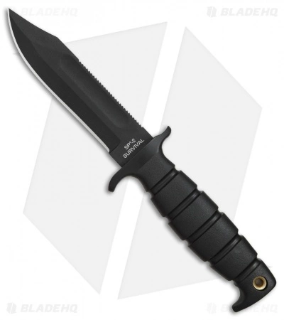 Take your tactical game to the next level with the Ontario Spec Plus SP2 Air Force Survival Bowie Knife. The SP2 offers a tactical design with a large Bowie style blade coated in a durable black epoxy powder finish. It’s equipped with a Kraton handle that provides comfortable ergonomics and a rubberized grip. The handle is rounded to fill the hand perfectly and features a full-guard for safe and secure use. Item includes a MOLLE compatible heavy duty nylon belt sheath.