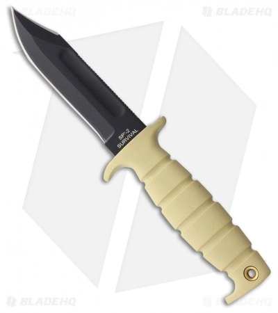 Designed as a do-all survival tool for military personnel, the Ontario Spec Plus SP-2 Survival Knife is a tool you can rely on. Made from tough 1095 carbon steel, the aggressive bowie shape features a pronounced tip, sharpened clip and saw back edge, all black powered coated for durability. Grooved tan Kraton handles provide an excellent grip on the knife while the integrated hand guard and pommel offer additional security. Securely carry the SP-2 with the included heavy duty black nylon sheath with snap closure.