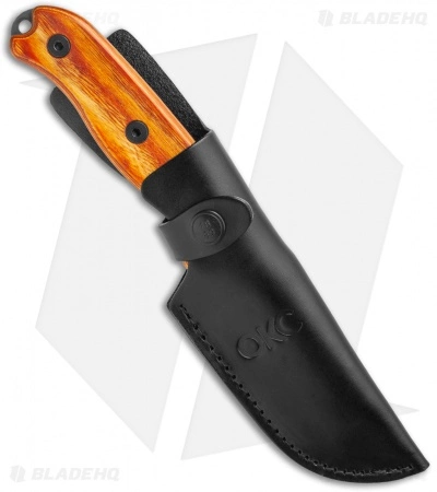 The OKC TAK 2 fixed blade knife will stand the test of durability. This knife has a full-tang 1075 high carbon steel blade with a black zinc phosphate finish. It features stabilized hardwood scales with three torx screws that secure them in place. Comes with a lanyard hole and a black leather sheath.