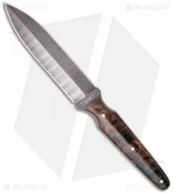 The Shadow Fighter DARK STAR from Paragon was made by master knife maker Eddie White. This fixed blade knife features Ladder pattern carbon Damascus 1520-1095V steel made by the cloisters. The burled Maple wood scales sit atop the full tang blade. The custom fitted leather sheath has a beautiful finish and includes a satin pocket clip. This is a gorgeous knife for those with discriminating taste.