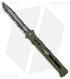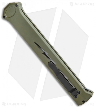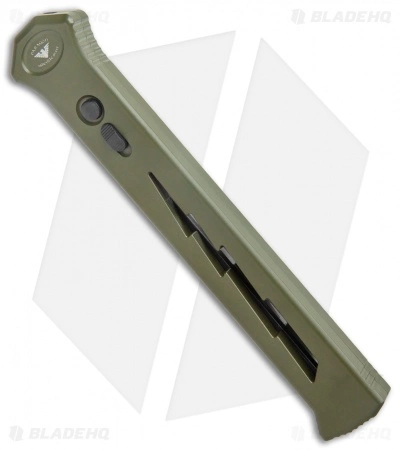 This edition of the Estiletto features lightning bolt cutouts on the front and back of the OD green brown finished aluminum handle. It is matched up with a black coated clip point blade with a double edge.