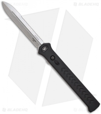 This Estilleto knife features a stonewash finished S30V steel dagger style blade with a plain edge and 3″ serrated edge. The handle is black anodized aluminum.