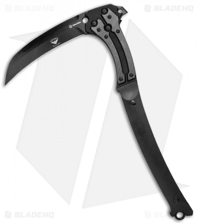 The Paragon Reaper Scythe is a meaty, wicked-looking tactical tool. It has a G-10 clad handle with carbon fiber accents, and a D2 blade with a black finish, a razor edge, and a wicked point. The piece comes complete with a secure kydex sheath that has a belt attachment. Add a skull mask and cloak to the mix, and you’ll be feeling like Death himself!