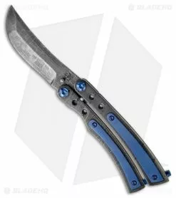 This custom collection piece from Patrick Famin Knives offers impressive details and damascus steel construction that will stand out in any balisong collection. The blade and handles are made from high quality damascus steel with titanium hardware and scales. The scales, hardware and latch have a dramatic blue anodization, that contrasts nicely with the gray damascus. It has an upswept blade with a flat grind and a plain cutting edge. Famin’s innovative Zirconia Pivot system provides a self lubricating pivot for the smoothest flipping possible.