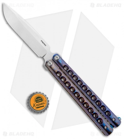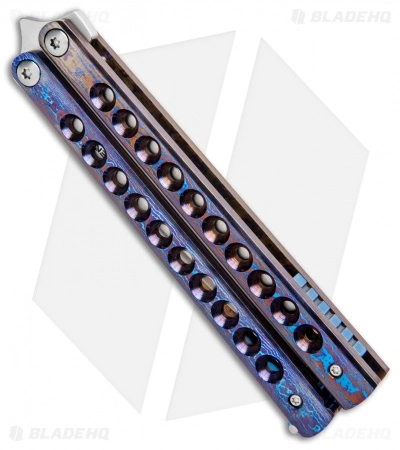 This model of the Penasong sports a beautiful mokuti handle with 10 hole pattern milling and a blue titanium latch. The blade is made from hand rubbed satin CPM-154.