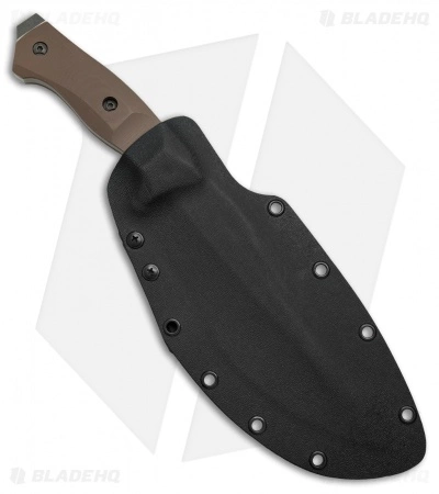 This heavy duty custom fixed blade from Peter Rassenti offers a collection worthy design with tough hard use materials. The CTS-XHP blade comes in a durable bead blast stonewash finish with a recurve belly and a clip point profile. Contoured coyote brown G-10 handle scales accent the quarter inch thick full tang. A pry bar pommel finishes off the rugged design. Item comes equipped with a kydex Tek-Lok sheath.
