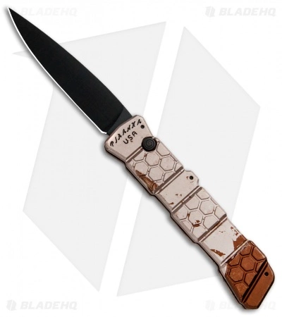 Add a comfortably sized automatic knife to your EDC rotation with the Piranha 21 series. This 21 model is outfitted with a black finished blade and a tan camo handle. The Piranha 21 is built with a hard coat anodized aircraft alloy handle that provides a sturdy frame while remaining light in the hand. A front-loaded firing button offers rapid deployment and a recessed design to prevent pocket misfires. The Piranha 21 series will make a great tactical addition to your everyday carry line up.