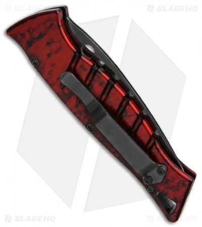 Piranha’s Amazon is another awesome automatic knife with hard-hitting action, so you’ll need to hold on tight! The 6061-T6 aluminum handles have grip grooves and a steel pocket clip. The 154-CM stainless steel blade has a great profile and masterfully integrated holes below the spine.
