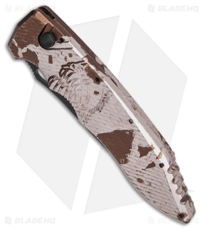 - Desert camo aluminum handle that is engraved with the Piranha logo.