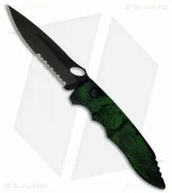 This Mini Predator has a green marble anodized aluminum handle with tactical hardware and a titanium pocket clip. The blade is black finished with a partially serrated edge.